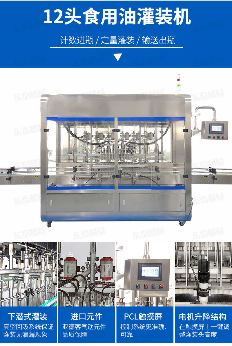 (2)摒棄了傳統(tǒng)夾瓶口灌裝方式,采用下潛式灌裝,在桶口以內約5-8mm處進行灌裝,下料口設計, 避免了灌裝速度快產(chǎn)生細小油珠噴濺污染瓶口的現(xiàn)象產(chǎn)生。配合多段式快慢速灌裝,可以保障高速灌裝時全速灌裝,又可有效解決氣壓過高快速灌裝時泡沫溢瓶現(xiàn)象,變頻控制更,自我保護更安全,穩(wěn)定,延長設備使用壽命。