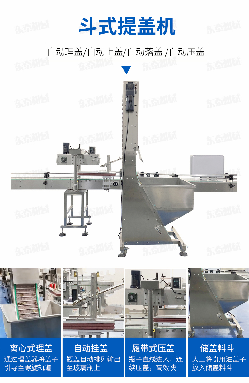 該提蓋式主要適用于制藥、食品、化工、日化等行業(yè),是自動化生產(chǎn)線中旋蓋機、壓蓋機等的理想配套設備。采用底部添蓋替代傳統(tǒng)的手動上蓋,使自動化工作更加方便、快捷。特別是對于要求不能有磨損的瓶蓋如印刷好后的蓋子需要到下一步工序生產(chǎn)或者包裝等,此設備也可強有效的減少磨損;其工作原理是通過微動開關檢測的作用,通過輸送刮板,把料斗里的瓶蓋按生產(chǎn)需要勻速的送入理蓋器中,確保了理蓋器內的瓶蓋能保持在佳的狀態(tài);